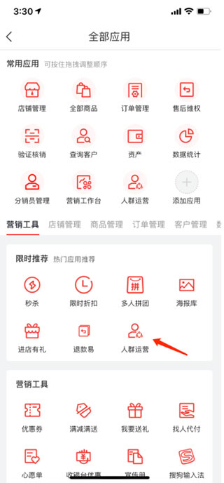切换到APP首页,即“店铺”tab,点击“全部”,在“限时推荐”和“客户管理”里有“人群运营”入口,点击“人群运营”进入推荐人群列表。目前支持 访问未支付客户、需重点召回客户、需重点发展客户、需重点活跃客户、需刺激消费客户 5类人群创建运营计划。支持展示 5类人群的定义和覆盖人数。