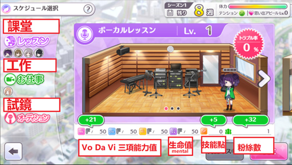 除了试镜及休息以外,行动都会消耗体力。体力越低,课堂及工作的失败率就会越高。