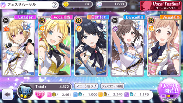 每一期Festival的流行状态都会不同,例如现时(开服到5月10日)是Vocal Festival,Vocal属性有额外加成。故此,编队及育成时可以特别培育对应属性的偶像,以挑战更高难度的Festival,并获得更高分数与奖励。