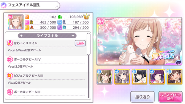 此时,Fes偶像就会诞生,只能够用作挑战Fes。如果下次再想育成同一角色的话,必须从头开始再育成一次,上次育成的能力值不会继承下去。不过每一次育成,都可以让你对偶像的喜好、对话的正确选择,以及游戏的熟悉程度增加,下次育成就更易得到强大的Fes偶像。