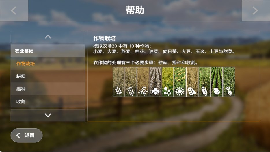 游戏内置详细的新手帮助系统,涵盖作物类型、耕地、播种、收割等内容,并列出20多种作物的完整流程,适合新手随时查阅。