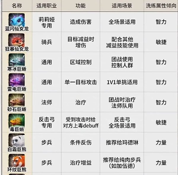 宠物目前一共有10种,宠物也分强度,稀有度越高,所能携带的技能就越多。宠物也分兵种,不同的宠物对应着不同兵种。