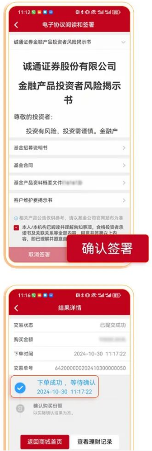在充分理解告知事项、合格投资者承诺书及关联关系等全部协议内容并愿意自行承担风险和损失之后,点击“确认签署”进入适当性匹配确认流程,所有流程通过将出现下单成功的结果详情展示。