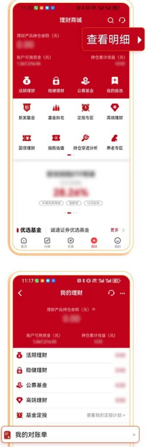 6.点击理财商城首页,“查看明细-我的对账单”,查询已购买的基金