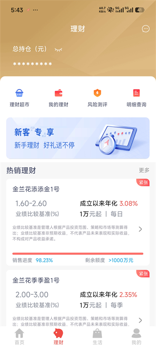 可查看总持仓,有理财超市、我的理财等功能,还展示了热销理财产品的业绩比较基准、成立以来年化等信息。