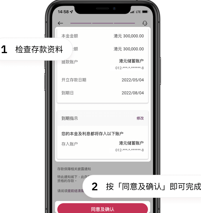 5.检查存款资料后,按「同意及确认」即可完成