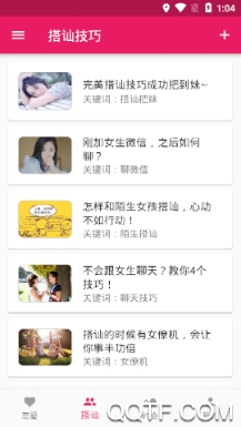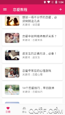 恋爱秘籍App是一款非常适合想恋爱以及刚开始恋爱的朋友们使用,相信很多小伙伴们还不知道怎么恋爱,怎么获得对方的开心,大家可以来看看这款软件,这里有很多恋爱资讯,教大家一些恋爱技巧以及恋爱中应该做什么,让你成为情场高手,不再是直男~